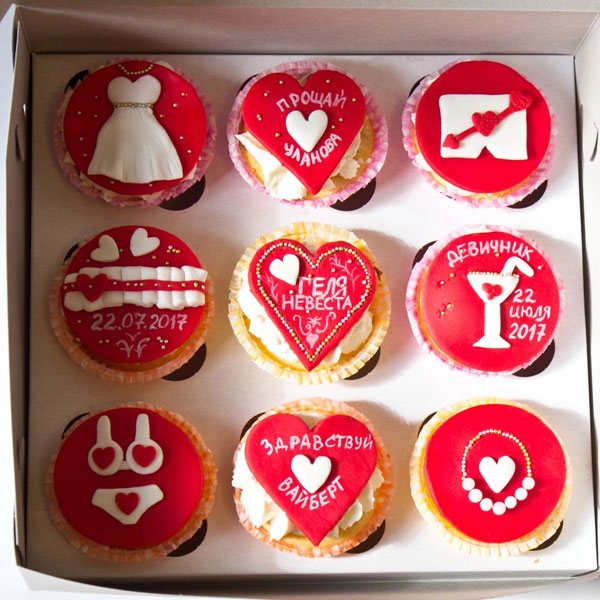 - В дизайне капкейков может присутствовать дата девичника и/или свадьбы;