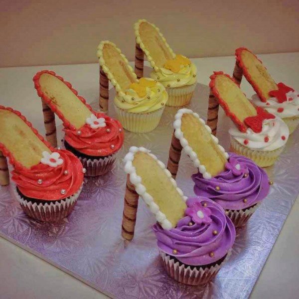 - Туфелька из капкейка. Сделать креативный и модный десерт можно при помощи кекса (передняя часть), вафельной палочки (каблук-шпилька) и крекера (остальная часть), украсив композицию на своё усмотрение.