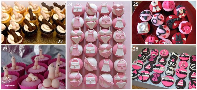 Какими именно будут топперы на вечеринке, зависит во многом от вашей фантазии. Вполне уместно смотрятся на капкейках для девичника декоративные элементы в виде разных «дамских штучек», например, губы, помада, сумочка, платье или туфелька.
