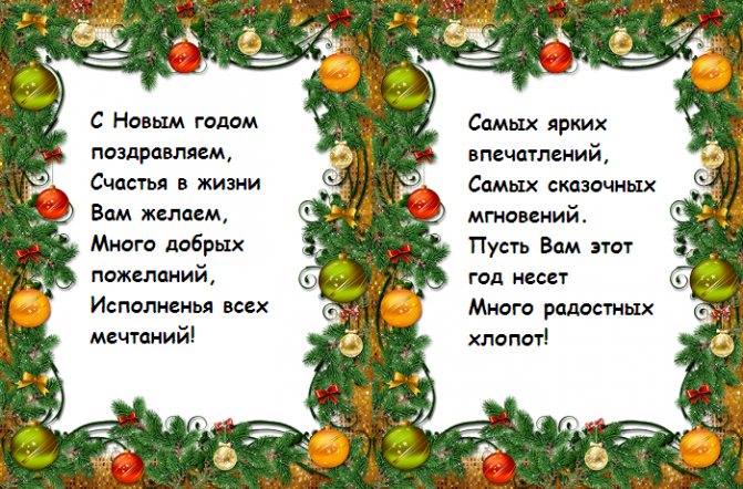 Новый год бежит к нам семимильными шагами, поэтому нет времени медлить. Пора основательно взяться за подготовку к новогоднему празднеству. И начать можно с выбора коротких новогодних пожеланий.