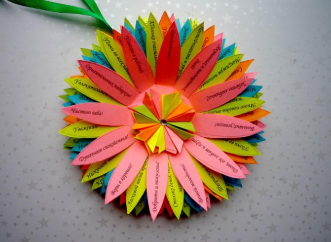 Более упрощенный вариант ― шаблоны лепестков с уже оформленными пожеланиями. Можно использовать белую офисную бумагу для распечатки лепестков, тогда у вас получится классическая ромашка.