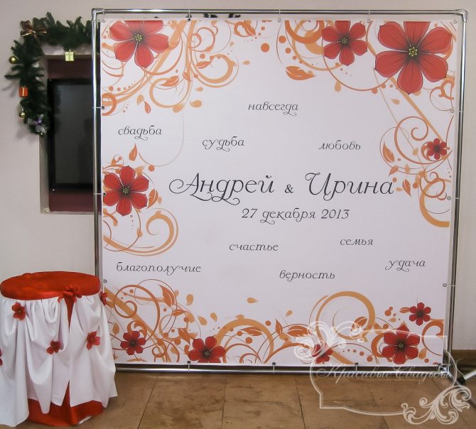 В качестве фона для самых красивых свадебных снимков можно использовать ширму – ажурную, украшенную монограммами молодых, памятной датой либо цветами. Можно заказать пресс-волл в фирме, занимающейся печатью на баннерах. Дизайнеры создадут изображение, которое станет фоном для фотографий. И новобрачным, и их гостям будет приятно фотографироваться на бело-красном цветочном фоне. Впрочем, вариантов оформления может быть много.