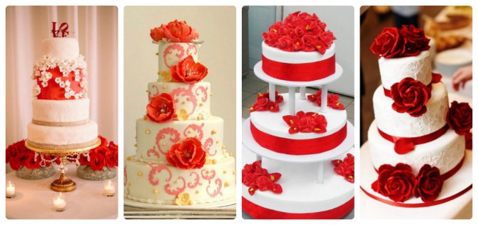 Свадебный торт тоже будет оформлен в бело-красном цвете. Если вы много внимания уделили цветочному оформлению торжества, гармоничнее будет выглядеть торт, украшенный сахарными алыми или красно-белыми цветами.