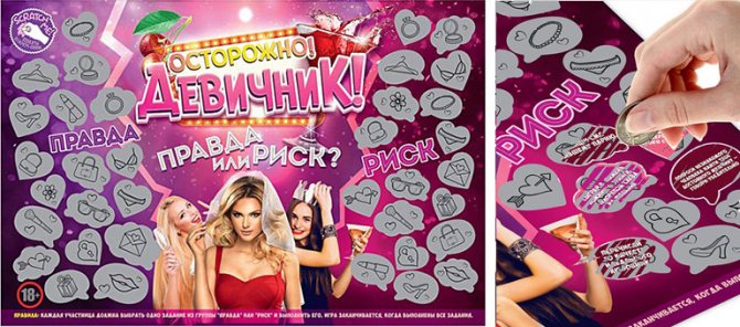 Скретч-плакаты (такие продаются в магазинах свадебных аксессуаров; на нем особые поля, которые нужно стирать монеткой, чтобы узнать задание или условия игры; баннер на фото ниже предназначен для проведения игры «Правда или риск»);