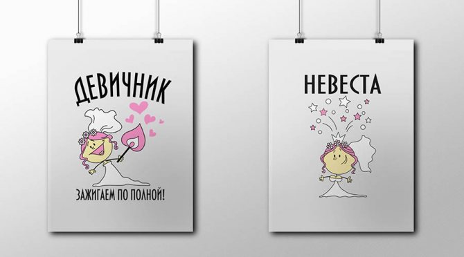 Типовые готовые постеры (содержат типовые фразы для холостяцкой вечеринки (например «Танцуем сегодня до упаду!») и являются больше декоративными; продаются в магазинах свадебных аксессуаров);