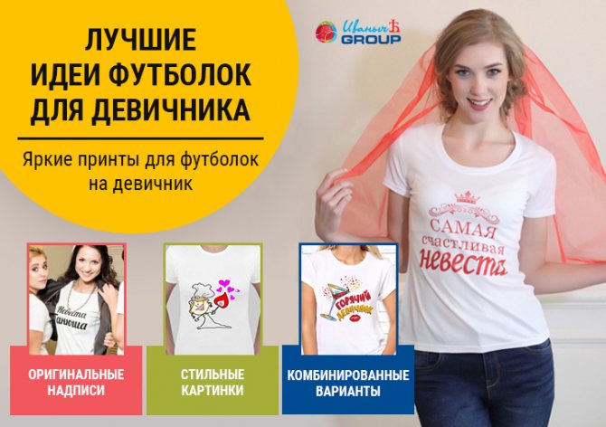 Заказать футболку на девичник очень просто. В Москве вы найдете самые подходящие модели этих трикотажных кофточек у компании ИванычЪ GROUP.Мы можем также напечатать фразу на футболке или любой рисунок. А для тех, кому трудно придумать свой собственный принт, предлагаем в этой статье множество идей, которые могут понравиться.