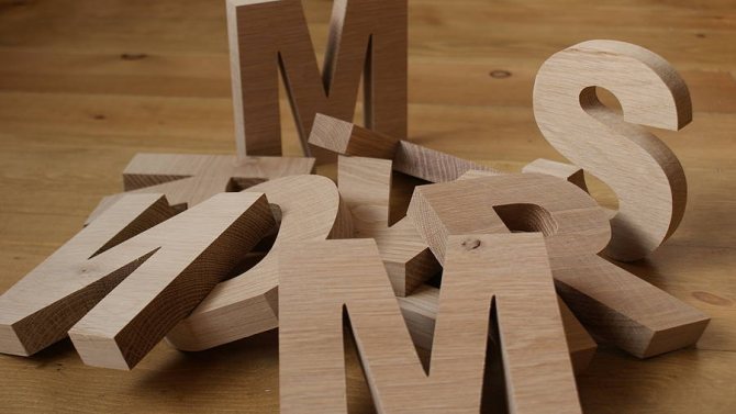 Изделия из древесины изготовить сложнее, но такие буквы прослужат дольше. Можно использовать как бруски дерева, так и фанеру. Однако во втором случае буквы окажутся плоскими. Для изготовления надписи необходимо также сделать трафарет, который переносят на заготовку, после чего выпиливают лобзиком.