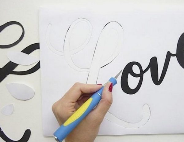 Если среди готовых трафаретов не удалось найти желаемый, можно изготовить собственный. Для этого используют распечатанные на листе формата А4 буквы, соединенные в нужную фразу.