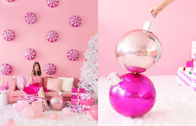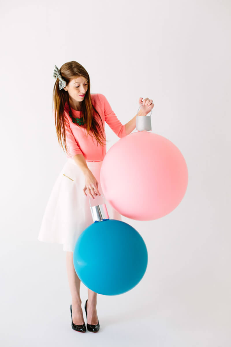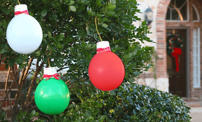 Если у Вас есть в наличии воздушные шары огромного размера, то и декоративные елочные шары можно сделать гигантского размера, что обязательно удивит ваших гостей.