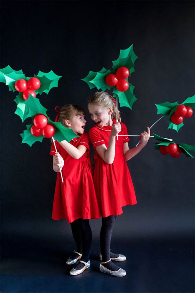 Листья остролиста сделайте из двусторонней цветной бумаги, а из ярко-красных воздушных шариков надуйте небольшие ягодки.