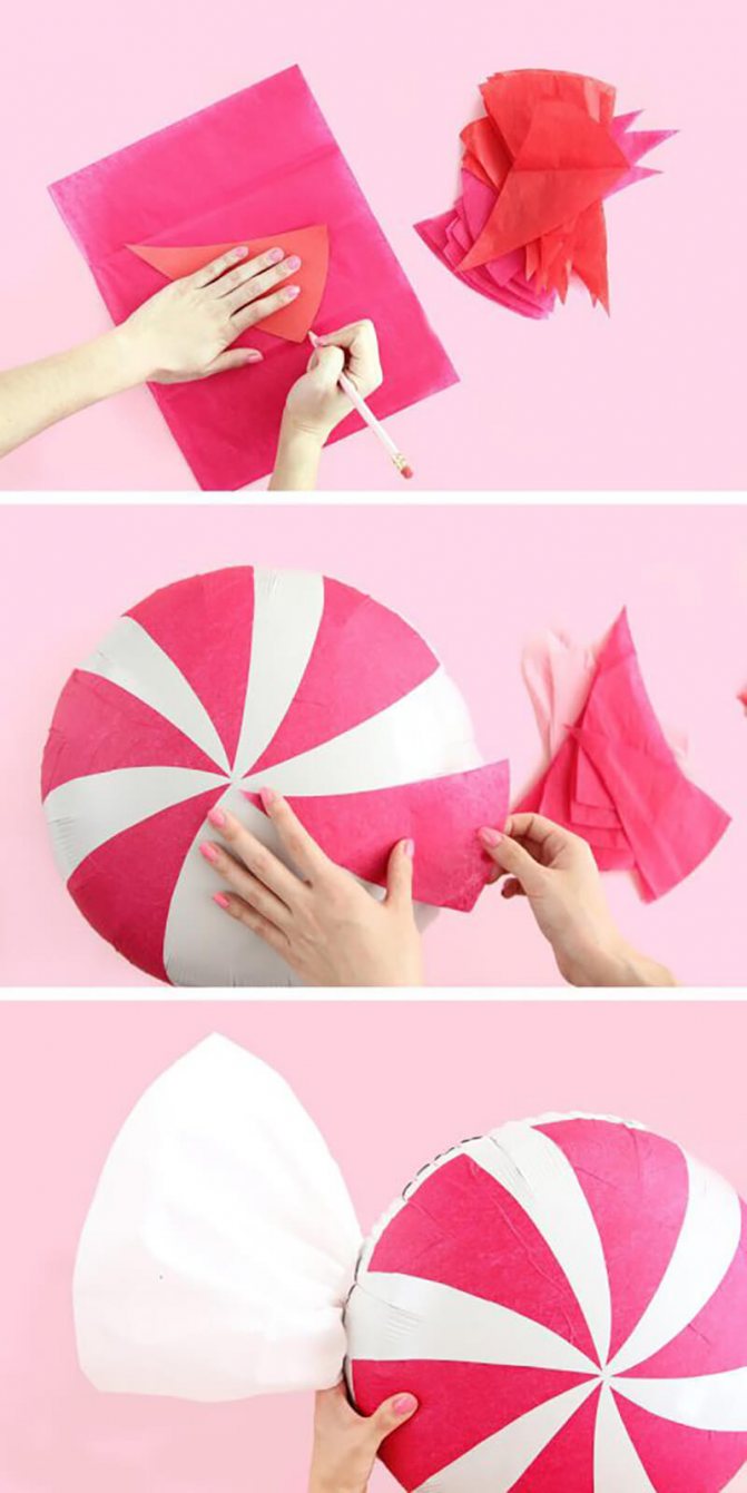 Для изготовления воздушных шариков в виде рождественских леденцов, Вам понадобиться розовая или малиновая бумага и белые круглые воздушные шары. Вырезайте из цветной бумаги треугольники (см. фото) и приклеивайте их к шарику при помощи двустороннего скотча или клея.