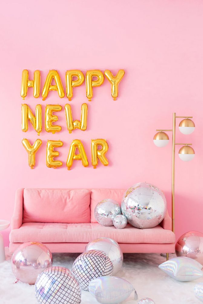 Если у Вас есть возможность прикупить в магазине целую новогоднюю надпись, которая состоит из отдельных букв-воздушных шариков, то ваш интерьер по умолчанию уже будет восхитительным!
