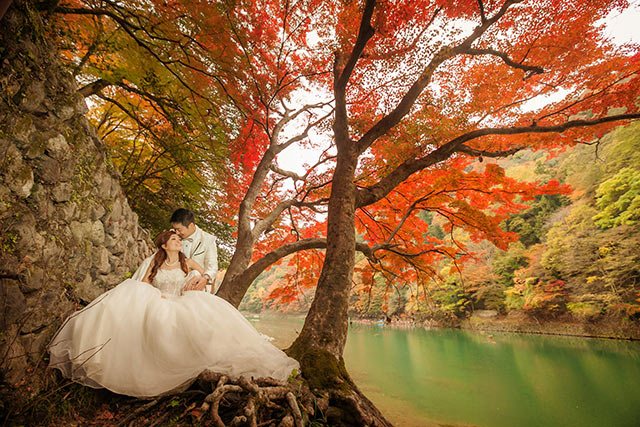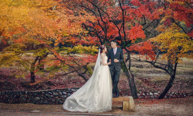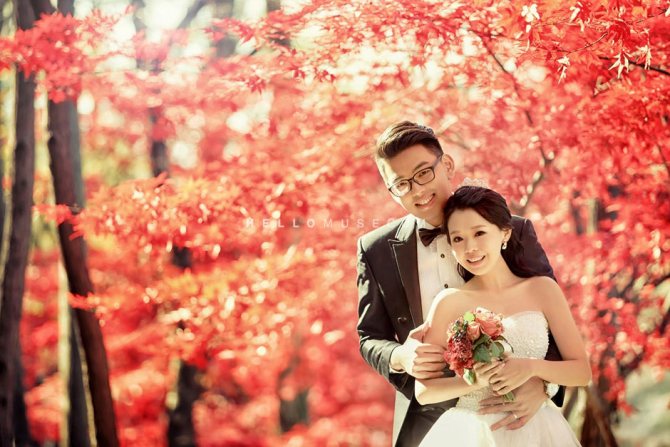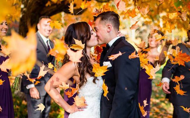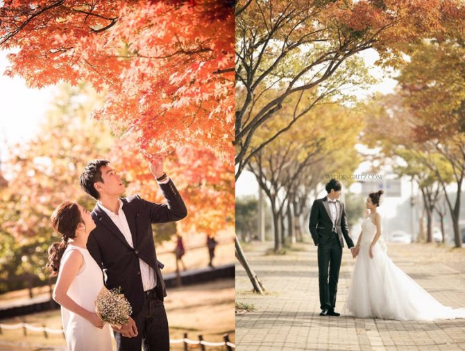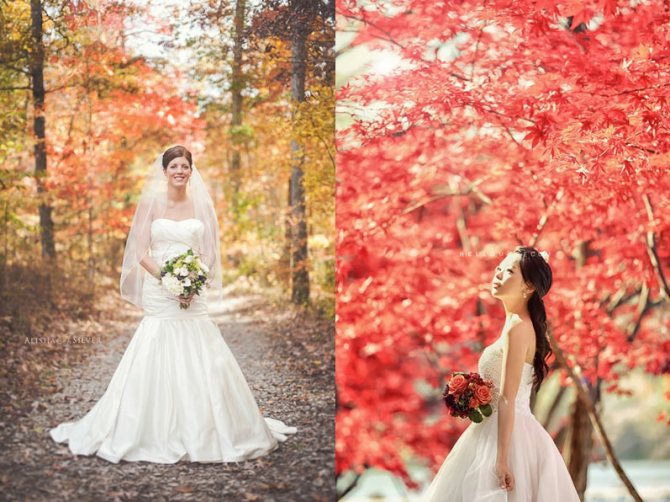 - Используйте цвет. Зачастую наряды молодоженов – это светлое платье и темный костюм. На фоне багровых, желтых, зеленых, оранжевых оттенков листвы и чистого голубого неба сдержанные тона одежды молодых будут выглядеть восхитительно, а снимки получатся стильными.