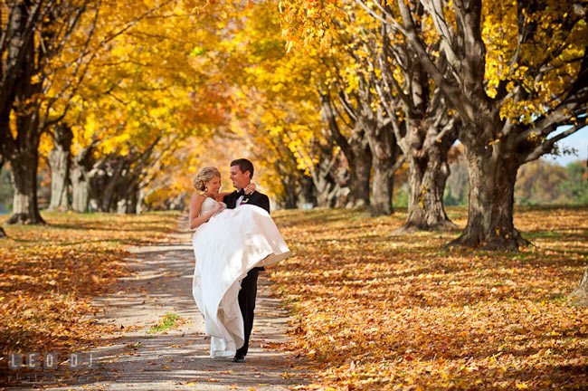 - Невеста на руках у жениха. Поза, без сомнения, используется в любой свадебной фотосессии. Но осенью ее можно задействовать по-новому. Закружите свою любимую среди разноцветного «ковра» из листьев.