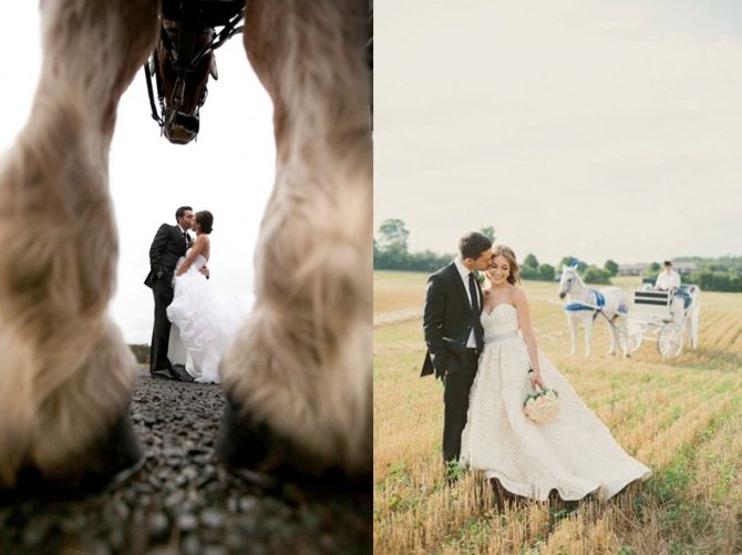 - Фото с животными. Свадебные снимки, на которых присутствуют лошади, придает кадрам особую атмосферу. Необязательно устраивать скачки или конную прогулку, можно сделать несколько фото рядом с этими чудесными животными. Также задействуйте для осенней свадебной фотосессии красивых собак (например, самоедов или доберманов). Устройте с ними прогулку по лесным тропинкам и сделайте несколько снимков на фоне заката.