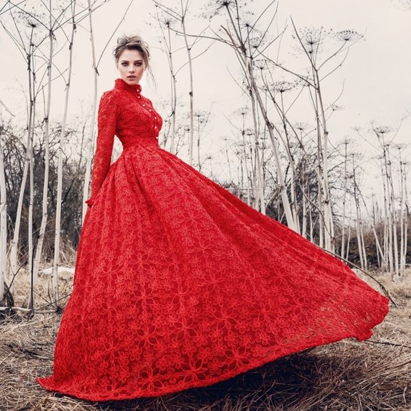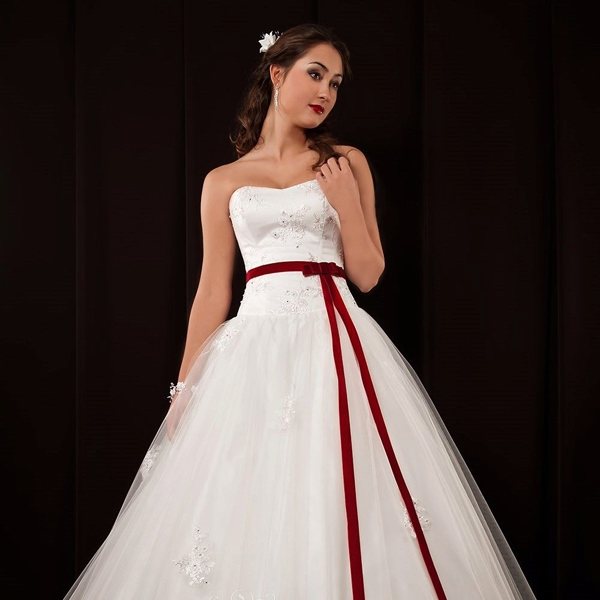 Другая идея — цветные акценты на белоснежном платье: это позволит гармонично соединить классику и модные тенденции. Например, оригинально смотрится классическое белое платье с контрастными ярко-красными разводами. Цвет может выступать и в качестве отделки: оригинальная цветная отделка шлейфа или контрастный пояс на талии.