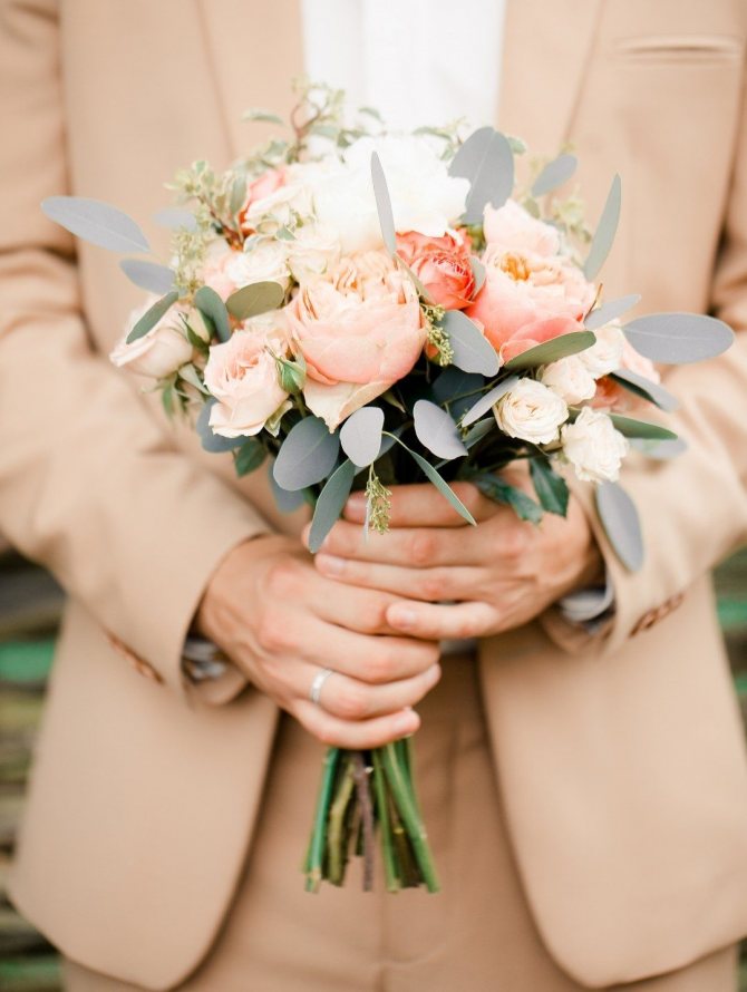 Так или иначе, шоколадный пиджак в сочетании с черными или кремовыми брюками станут неплохим вариантом для жениха, который не хочет отставать от своей невесты и выделяться вместе с ней в паре.