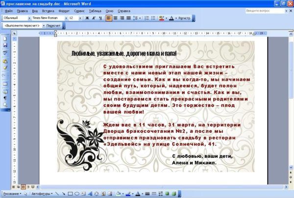 И несмотря на то, что она специализируется на создании текстовых файлов, приглашения, сделанные в ней, получаются красивыми. В отличие от специализированных программ обработки изображений, таких как фотошоп, интерфейс Ворд предельно прост и не требует глубокого изучения инструкций.