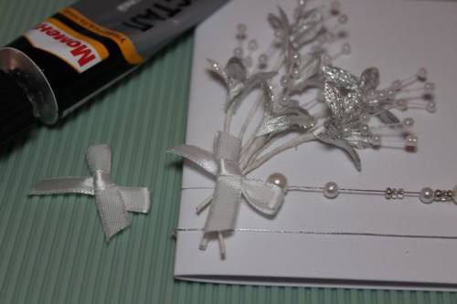 3.Из атласной ленты шириной 2,5 см делаем бантик. Бантик к открытке крепим клеевым пистолетом.
