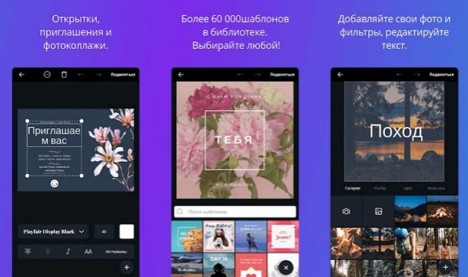 Canva — очень мощное приложение, позволяющее создавать почти профессиональные поздравительные открытки, визитные карточки, обложки, логотипы и баннеры. После установки приложения вам будет предложено пройти бесплатную регистрацию. Затем вы сразу же получите доступ ко всем многочисленным опциям и настройкам. Среди тематических разделов можно найти и «Приглашение», прокрутив список в верхней части экрана.