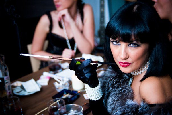 Так же в тридцатые было модным курить сигарету на длинном мундштуке и даже если вы не курите, такой аксессуар добавит шарм в образ. Для макияжа следует сделать акцент на глаза и губы: глаза должны быть с растушеванными стрелками, а губы ярко красными или вишневыми, волосы стоит завить щипцами и сделать красивые волны.