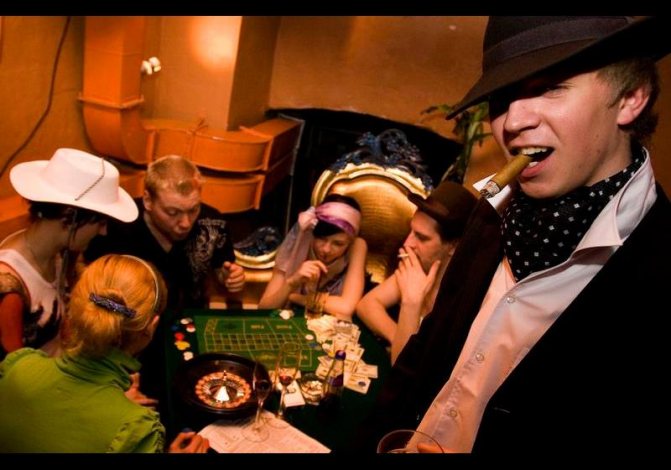 Для гангстерской вечеринки, как нельзя кстати подойдет выездное казино с разнообразными азартными играми. Все присутствующие по достоинству оценят игру в покер под стаканчик виски и сигару, а выигранные фишки можно будет обменять в мини магазинчике на сигару или бутылку виски. Что бы, не было скучно, стоит заранее продумать конкурсы и игры для присутствующих.