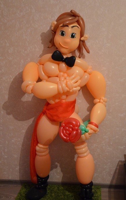 Мужчину из воздушных шаров можно также преподнести невесте в качестве подарка на девичник, обыграв это соответствующим образом. Повеселятся все – даже жених, который наверняка захочет познакомиться с тем «подлецом», который щеголял своими мускулами перед его возлюбленной.