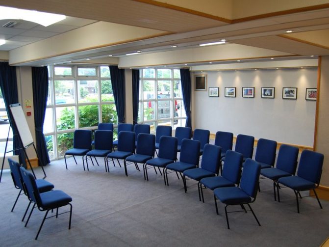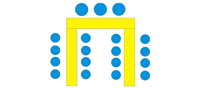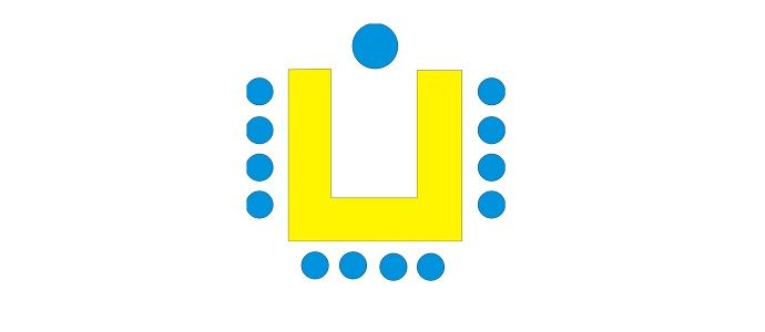 Буквой U столы чаще всего выставляют для проведения семинаров, переговоров или докладов, в ходе которых спикеру необходимо свободно перемещаться по аудитории. Данная схема дает открытый доступ к экрану и позволяет подойти к любому из участников.