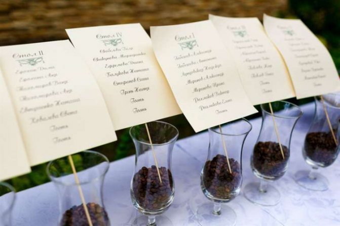 - Делается план рассадки с номерами столов и указанием имен гостей, а на столы ставятся карточки с их номерами и именами, показывающие конкретные места.