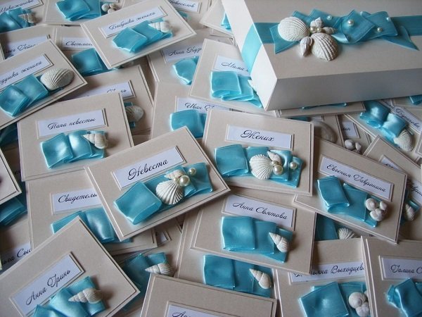 Украшения для банкетных карточек подбирают индивидуально. Ленточки, стразы, пайетки или бусины отлично подойдут для классической свадьбы. Если торжество оформлено в морском стиле, то для декора используют камешки, ракушки, кораллы. Украшения в виде цветов, бантиков или аппликаций будут уместны на любой свадьбе.