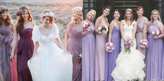 Если невеста выбрала платье сиреневого цвета, то гости и подружки невесты могут быть одеты в светлую одежду белых или бежевых тонов. А если невеста собирается предстать в белоснежном платье, то гостям следует выбрать наряды в сиреневом или фиолетовом цветах.
