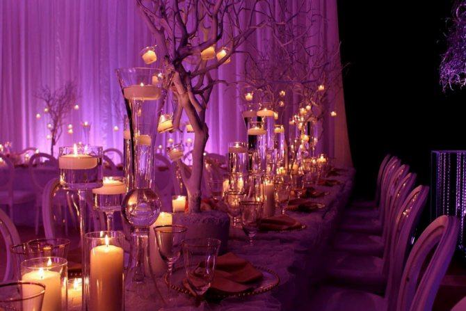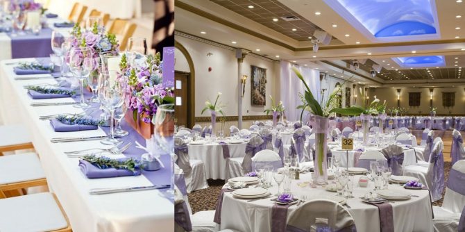 Для декора стола можно использовать не только флористические композиции, но и другие аксессуары. Зажженные фиолетовые свечи, расставленные среди блюд и напитков, придадут торжеству романтическую атмосферу. Обычно стол для новобрачных оформляют более пышным декором. Скатерть украшают дополнительными драпировками из ткани и цветочными гирляндами. При выборе посуды стоит отдать предпочтение белому фаянсу или фарфору с тонкой серебристой каймой или ажурным растительным орнаментом. Такая сервировка будет сочетаться с любыми оттенками фиолетового, лавандового или сиреневого цвета.