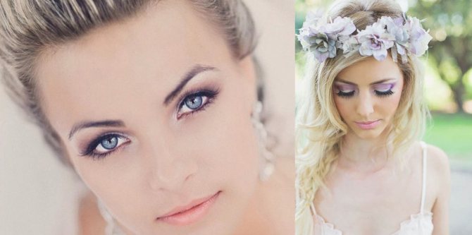 - Макияж. Для большинства вариантов образа невесты в лиловом цвете подойдет неброский макияж в природных тонах. Оттенки подбирают в зависимости от типа внешности, цвета кожи и волос новобрачной. Но даже ярким брюнеткам не стоит увлекаться слишком броскими тонами помады и теней. Открытый красный или коралловый цвет губной помады не слишком гармонично сочетается с тонами платья. Если все же есть желание сделать яркий экстравагантный сиреневый макияж на свадьбу, то лучше обратиться за помощью к стилисту. Профессионал поможет подобрать гармоничную цветовую гамму и подходящие оттенки.