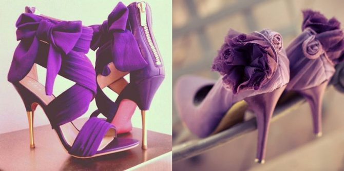 - Туфли и другие аксессуары. Обычно туфли подбирают в тон к свадебному платью. Но если наряд отличается простотой кроя и лаконичностью линий, то обувь может стать одним из ярких аксессуаров, которые придадут наряду эффектный праздничный вид. Красиво будут смотреться яркие лиловые туфли в ансамбле с платьем нежных лавандовых тонов. Но в этом случае цвет обуви нужно поддержать элементами того же оттенка. Это могут быть банты, украшающие юбку или корсаж платья, перчатки, пояс, бижутерия или другие свадебные аксессуары в насыщенном сиреневом цвете.