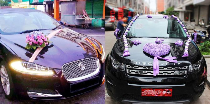 В качестве свадебного кортежа лучше арендовать сиреневый или фиолетовый автомобиль. Но белая или черная машина тоже будет смотреться отлично, если украсить ее лентами, цветами и шарами.
