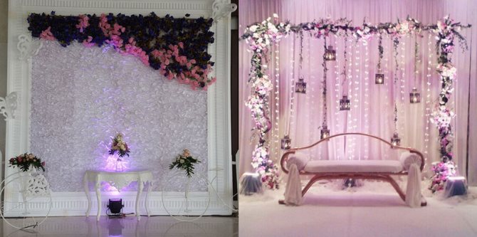Сайт www.svadbagolik.ru предлагает использовать в сиреневом оформлении свадьбы декоративные элементы для свадебного банкета, а также места церемонии бракосочетания легкие сиреневые ткани. С их помощью можно легко украсить как столы и стулья, так и потолок, что создаст атмосферу легкости и воздушности. Более того, можно украсить зал фиолетовой подсветкой. Этот вопрос заранее обсудите с организаторами свадьбы или менеджерами заведения. Атмосфера таинственности будет обеспечена! Сиреневая свадьба на фото – лучшее тому подтверждение!