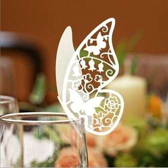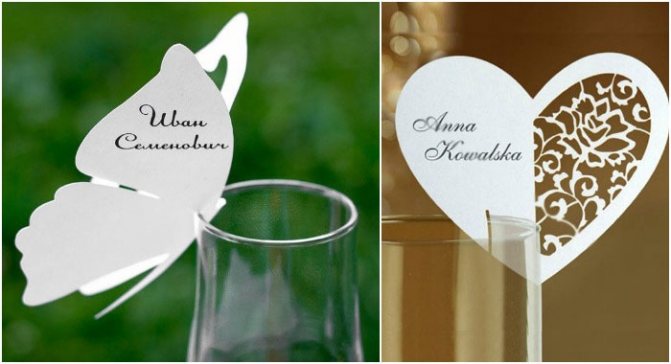 Популярность закрепления рассадочной карточки на бокале заключается в простоте, удобстве, а также изяществе способа. Для этого подойдет карточка-сердце, бабочка, обычная визитка: делается один или несколько надрезов, с их помощью аксессуар помещают на стенку праздничного фужера.