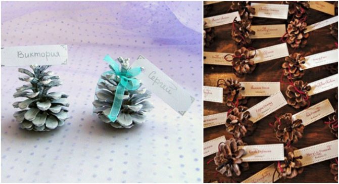 Эти оригинальные подставки идеально украсят выездное торжество, которое проводится на природе. Также вы можете сделать зимний вариант – распылить белую, светло-голубую краску по краям шишек, а сверху закрепить карточку.