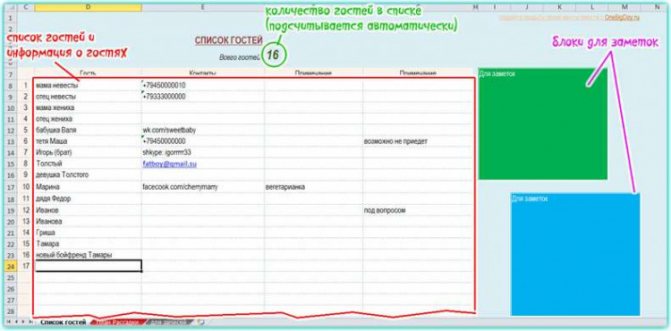 До момента создания декоратором красивых планов с нумерацией столов и карточек для гостей, список можно подготовить на простом листке бумаги или в документе WORD на компьютере.
