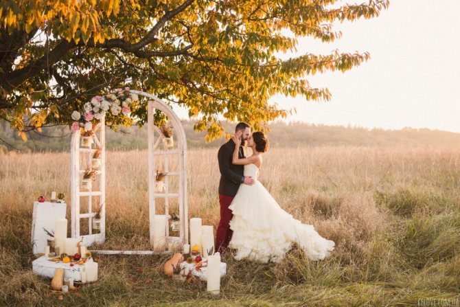 В заключение несколько слов о свадебных фотографиях, которые останутся у вас на всю жизнь. Разноцветные листья и мягкий солнечный свет – идеальные декорации для сказочных снимков. Даже если на праздник пойдет дождь, поверьте, для профессионального фотографа он не будет помехой. И главное – наслаждайтесь подготовкой и самой свадьбой!
