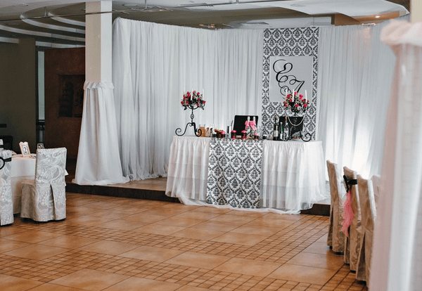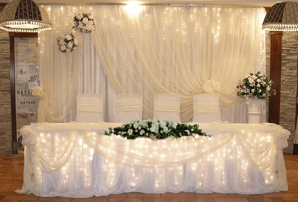 Создать легкость и воздушность поможет оформление задника тканью. Можно драпировать его полупрозрачными тканями – шифоном, легким шелком, органзой, фатином. Дополнить драпировки можно цветочными композициями, используя искусственные цветы.