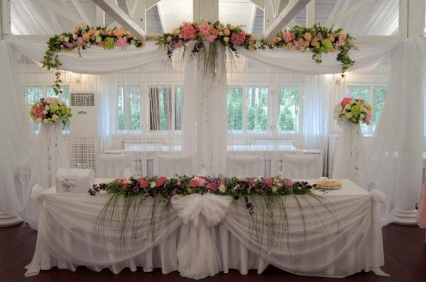 Особое отношение – к оформлению зоны молодоженов. Традиционным элементом президиума является оформление задней ширмы за столом молодых.