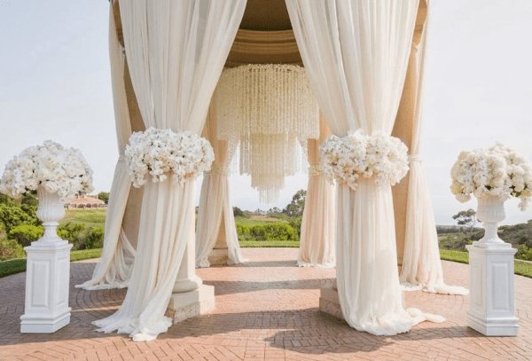 Свисающие композиции из белых цветов с добавлением зелени будут отличным дополнением как к традиционной тканевой ширме, так и к современной ажурной, выполненной из дерева. Она выглядит легко и воздушно и станет красивым фоном, на котором молодая пара будет выглядеть еще ослепительнее.