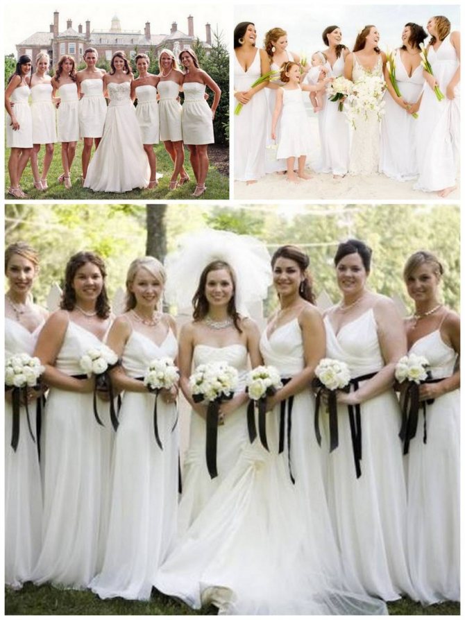 В последние годы стало модным подбирать идентичные наряды для подружек невесты, выполненные в одном цвете. Если запланирована белая свадьба, девушкам можно пошить белые платья одинакового фасона, дополнив их образ яркими деталями – красивыми аксессуарами или букетами цветов.