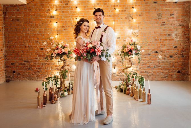 - Коричневый и оранжевый. Тандем с темным оттенком делает оранжевый цвет благородным и спокойным. Коричнево-оранжевая свадьба – меланхоличная, но стильная.