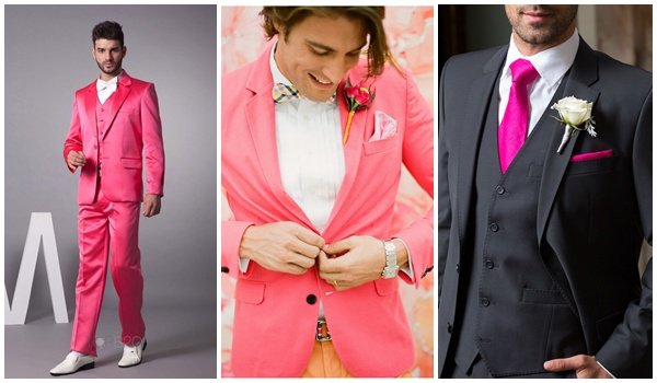 - Розовый костюм с фиолетовыми лацканами и запонками под цвет пиджака.