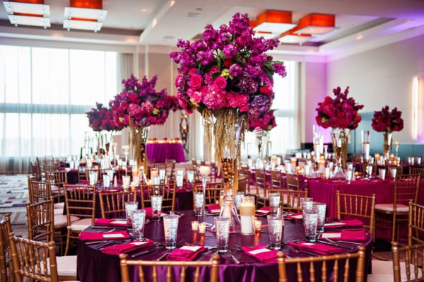 Оформление зала свадьбы в цвете фуксия выглядит благородно, поэтому стоит акцентировать внимание не только на узорах и предметах интерьера, но и на отдельных элементах.