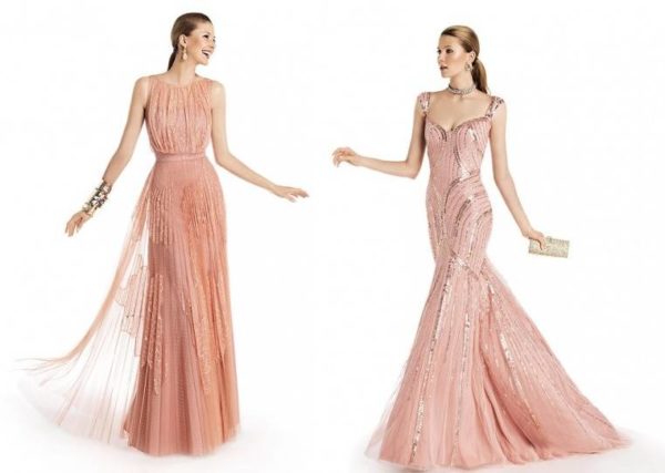 Сексуальный, но консервативный наряд подразумевает использование легкой ткани. Лучше пошить платье с прозрачными рукавами и окантовкой из ленты и горного хрусталя, которые отлично смотрятся с парой замшевых ботильонов и минималистическими украшениями. Цвет фуксия необязательно использовать. Розовый подойдет отлично.
