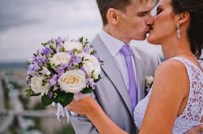 - Букет невесты должен дополнять ее образ и гармонично сочетаться с оттенком и фасоном наряда. Роскошные цветы фиалковых оттенков притягивают взгляд и выглядят необычно. Допустимы и светлые, и даже чисто-белые бутоны, а также смелые сочетания из 2-5 оттенков, с более яркими акцентами. Отлично смотрится бело-фиалковый вариант или фиолетовые цветы, разбавленные яркими желтыми и алыми мазками.