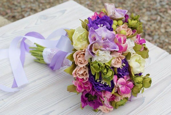 Интересно! Кроме живых цветов, для букета невесты цвета фуксии можно использовать и искусственные материалы: пуговицы, игрушки, бумажные цветы, ювелирные украшения, конфеты, фетр. Узнайте подробнее о разнообразии форм и фактур.